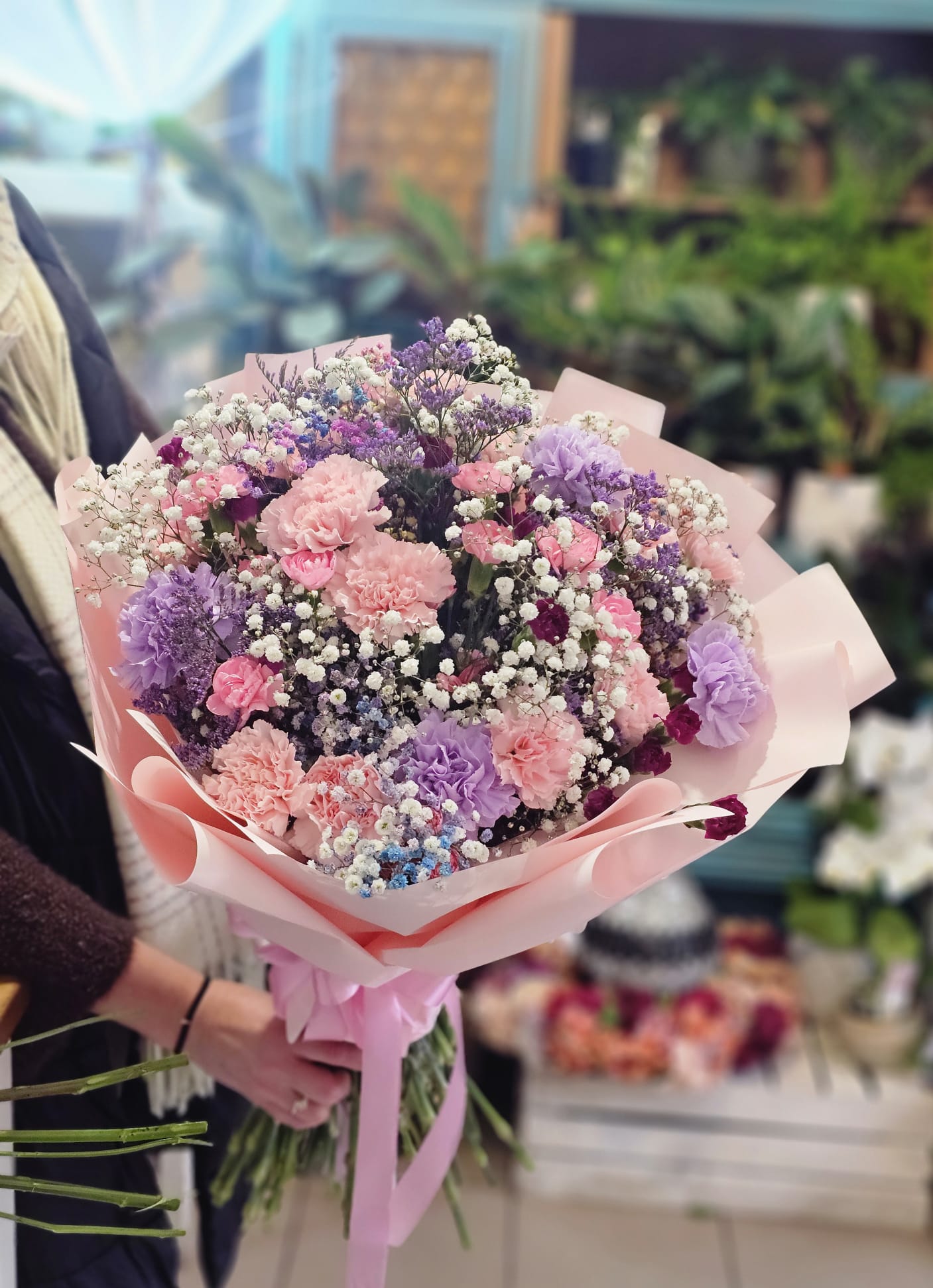 Bukiet wykonany z 20 goździków w kolorze różowym i fioletowym, uzupełniony białą gipsówką.