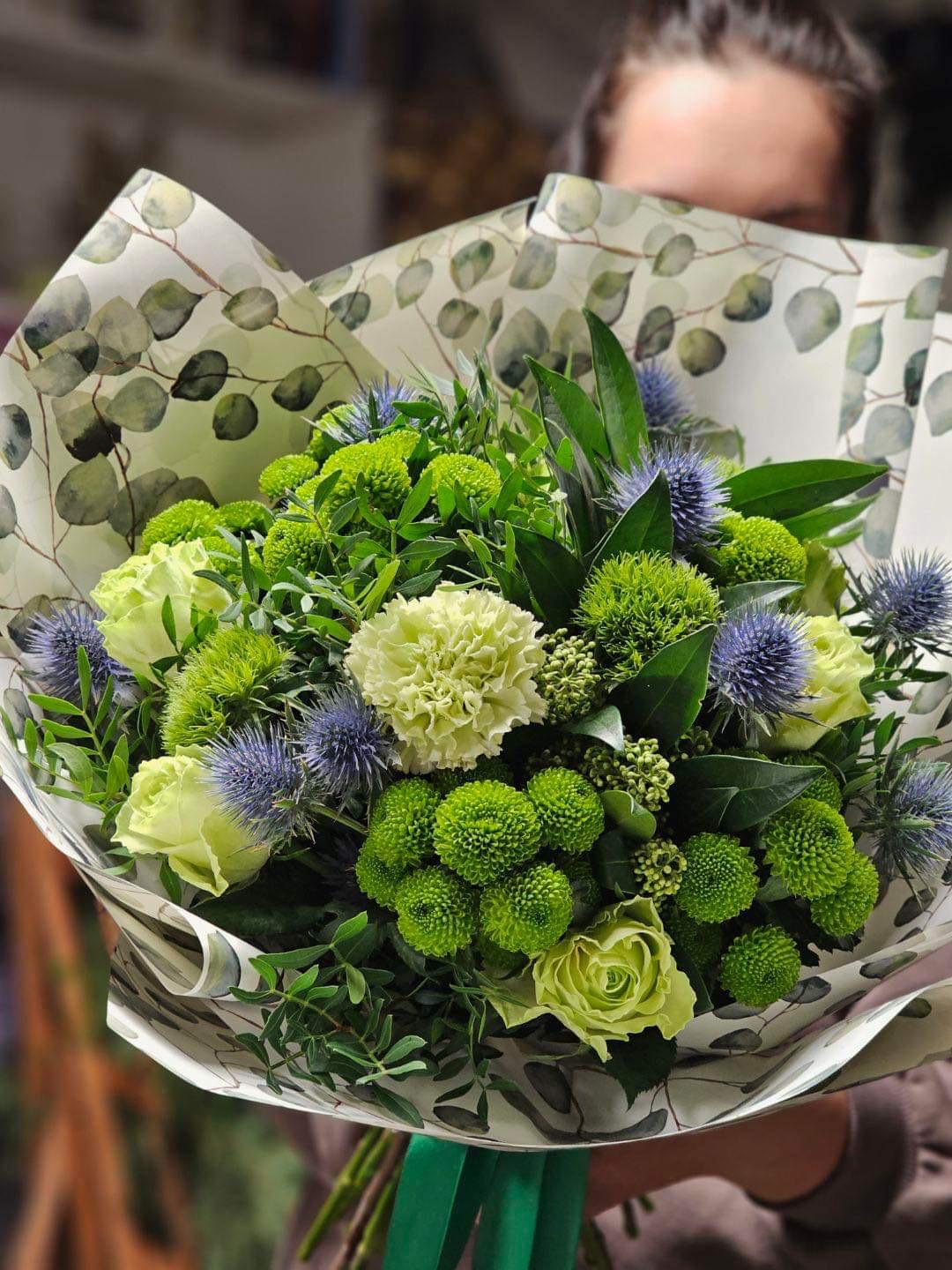 Wykonany przez doświadczonego florystę bukiet w odcieniach zieleni i niebieskiego.