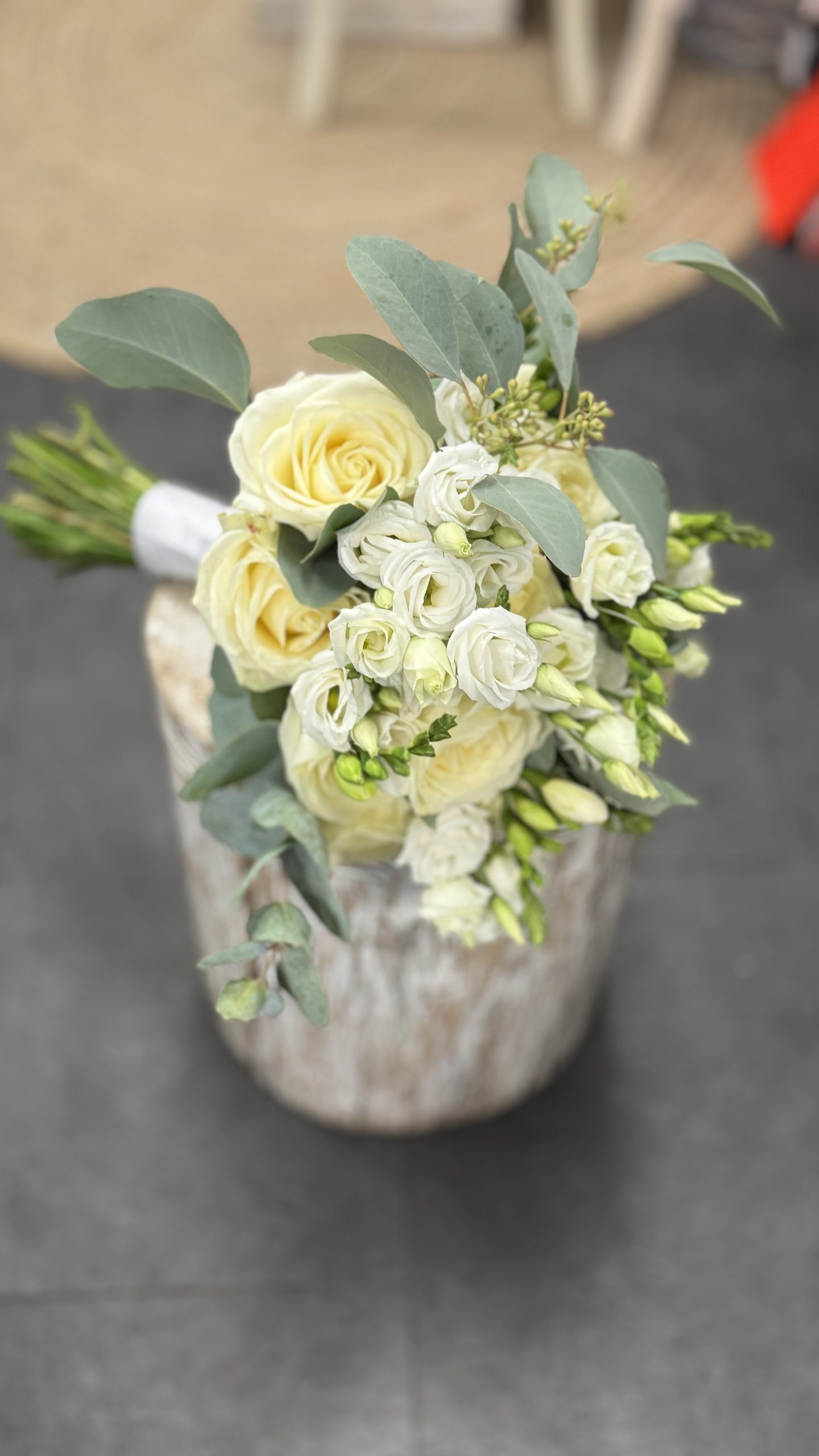 „Ivory” to bukiet w bardzo delikatnej, „czystej” stylistyce: kremowa róża, eustoma, biała frezja i eukaliptus. Pasuje do większości sukien ślubnych. Rączka owinięta satynową taśmą.