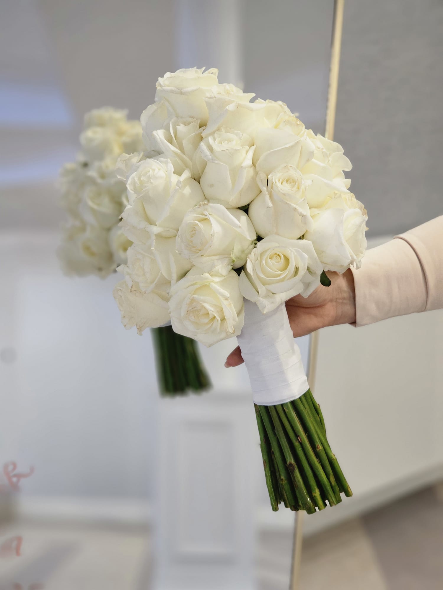 Elegancki bukiet z róż ułożonych stożkowo. Idealny do klasycznej sukni ślubnej.