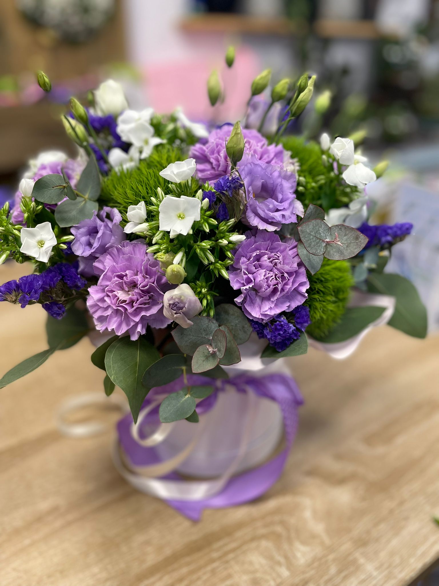 Średni flower-box wykonany z fioletowych i zielonych goździków, eustomy i białych dodatków.