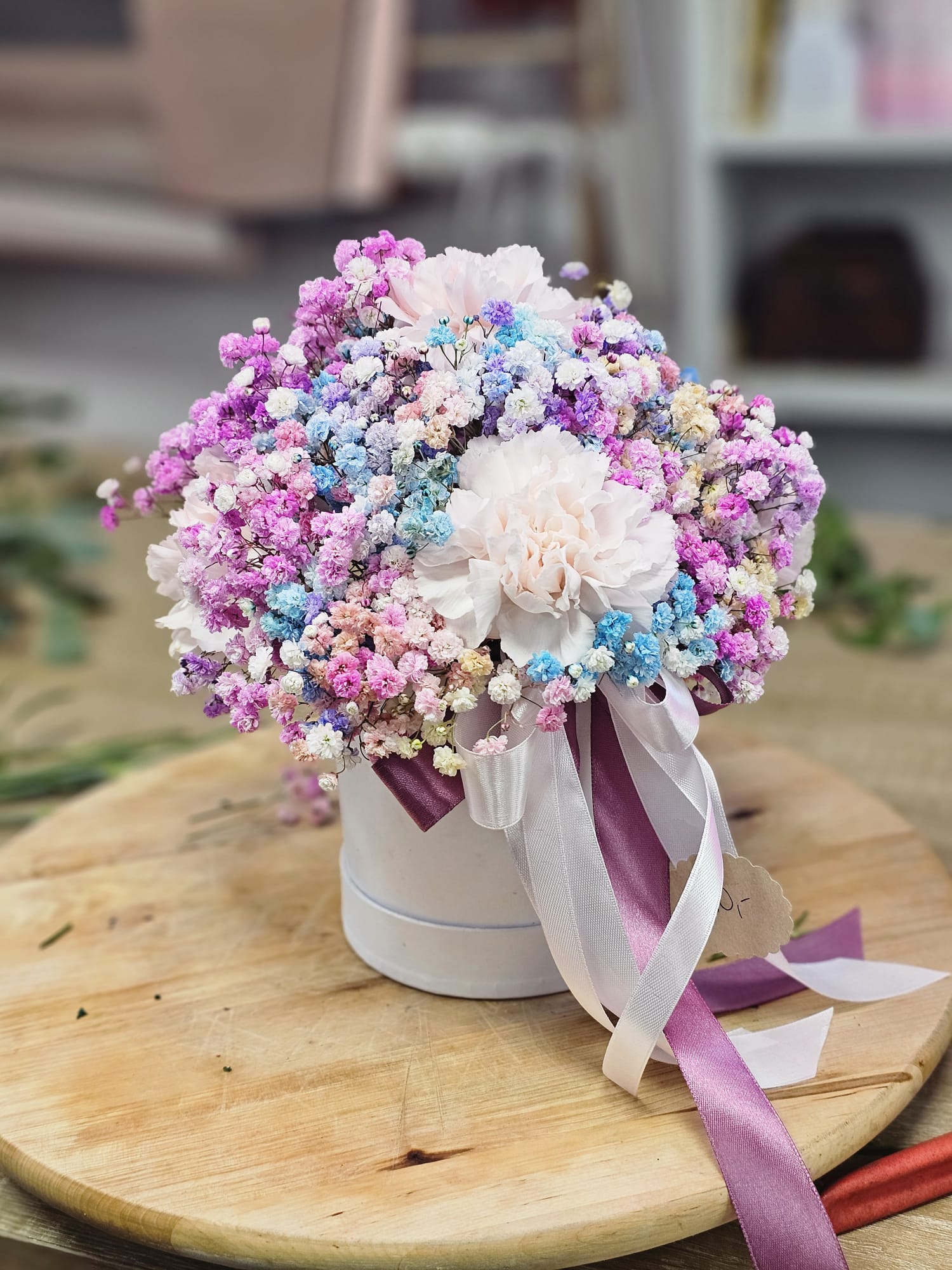 Mały flower-box wykonany z białych goździków i tęczowej gipsówki.