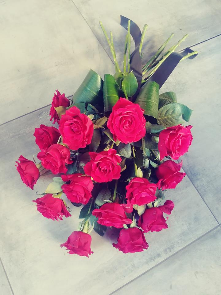 Kwiaty: 20 czerwonych róż, aspidistra.