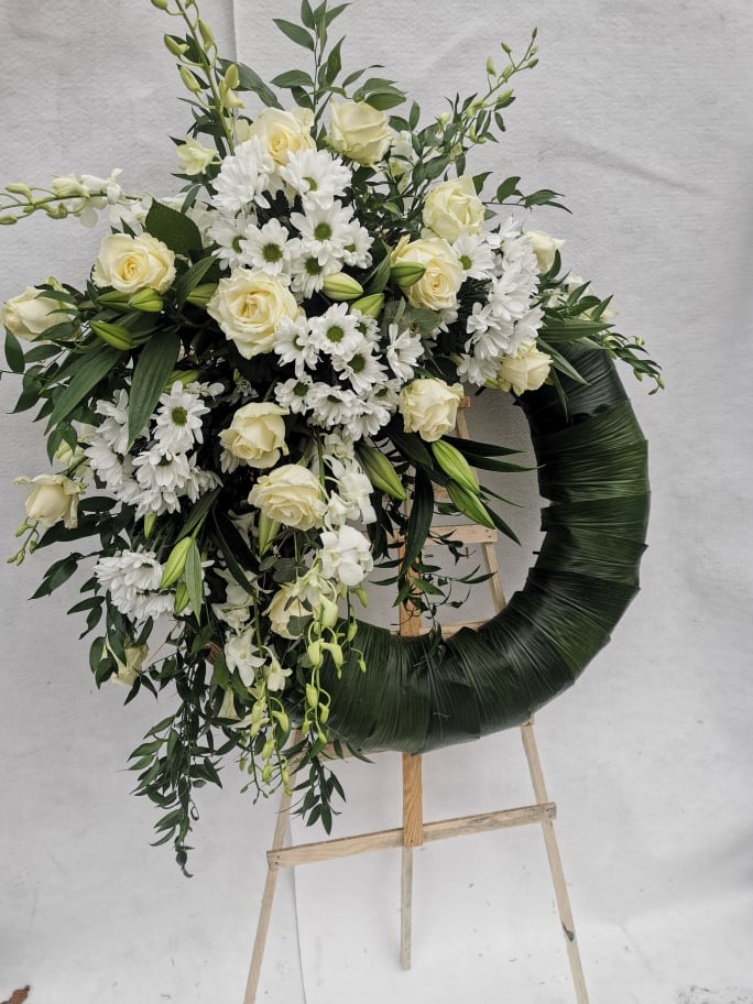 Do jego przygotowania wykorzystaliśmy białe róże, chryzantemy, storczyki dendrobium, lilie oraz ruskus i zieleń sezonową.