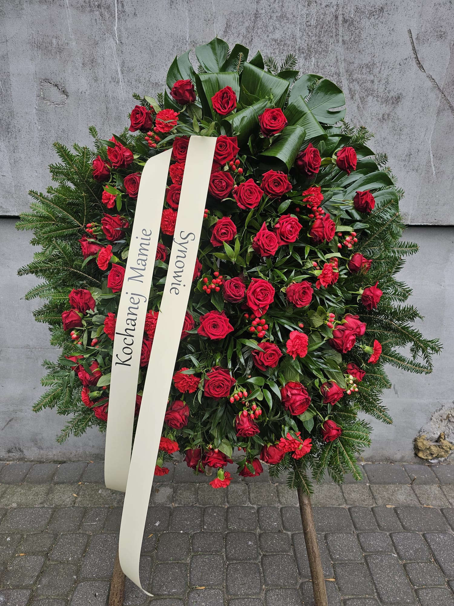 Kwiaty: czerwone róż, goździki, hypericum.